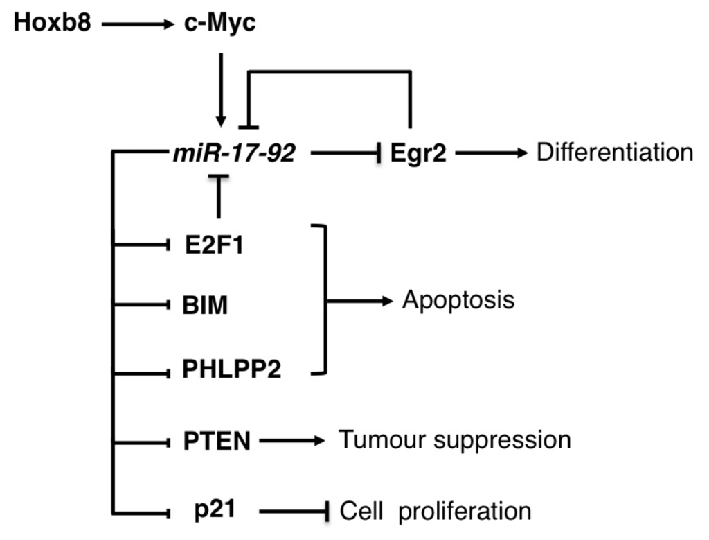 The miR-17-92 cluster was also found overexpressed in AML with MLL rearrangements and its expression was suggested to contribute to the self-renewal capacity of leukemic cells [19,89,90]. In addition, inhibition of the miR-17-92 expression cluster has been associated with monocyte/macrophage differentiation of both normal progenitors and AML cells [19,20]. A regulatory loop between the pro-differentiative transcription factor Egr2 and the miR-17-92 cluster has been recently described in AML, in which Egr2 is both a repressor and target of miR-17-92 components [19]. During monocytyc differentiation Egr2 is activated by PU.1 and binds to the miR-17-92 cluster promoter leading to transcriptional repression and, eventually, up-regulation of miR-17-92 targets, including Egr2. By contrast, increased miR-17-92 levels results in low expression of Egr2 and other relevant targets and might contribute to the block of differentiation that characterizes AML cells [19]. The oncogenic HOX gene, HOXB8, whose increased expression contributes to development of AML, was recently identified as positive regulator of c-Myc and consequently of the miR-17-92 cluster [21]. Moreover, the pro-apoptotic BIM protein was identified as a relevant miR-17-92 target. Therein, it was suggested that one of the mechanisms by which HOXB8 sustains AML cell viability is through the indirect down-regulation of BIM [21].