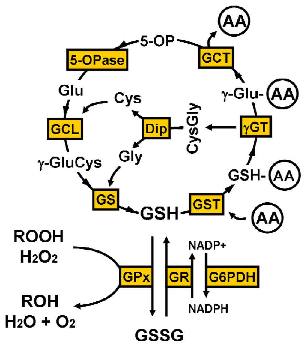 The γ-glutamyl cycle. AA, amino acids; Cys, cysteine; CysGly, cysteinylglycine; Dip, dipeptidase; GCL, γ-glutamylcysteine ligase; GCT, γ-glutamyl cyclotransferase; γGT, γ-glutamyl transpeptidase; γGluCys, γ-glutamylcysteine; Glu, glutamate; Gly, glycine; G6PDH, glucose-6-phosphate dehydrogenase; GPx, glutathione peroxidase; GR, glutathione reductase; GS, glutathione synthetase; GSH, glutathione; GSSG, glutathione disulfide; GST, glutathione-S-transferase; H2O2, hydrogen peroxide; NADPH, nicotinamide adenine dinucleotide phosphate; 5-OP, 5-oxoproline; 5-OPase, 5-oxoprolinase; ROH, alcohol; ROOH, hydroperoxide.