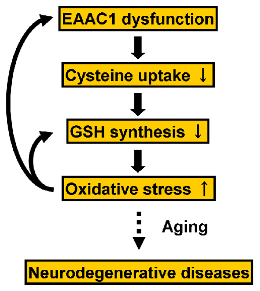 Inhibition of EAAC1 expression by an antisense oligonucleotide significantly reduced the cysteine uptake, intracellular GSH levels, and cell viability against oxidative stress in cultured neurons []. Consistently, EAAC1-deficient mice show decreased GSH levels in the brain and vulnerability to oxidative stress. Interestingly, EAAC1-deficient mice also show brain atrophy, spatial learning and memory dysfunction, loss of dopaminergic neurons in the SN, and movement disorder at advanced ages but not when younger [,]. These findings suggest an involvement of EAAC1 dysfunction in brain GSH depletion leading to neurodegeneration (Figure 2).