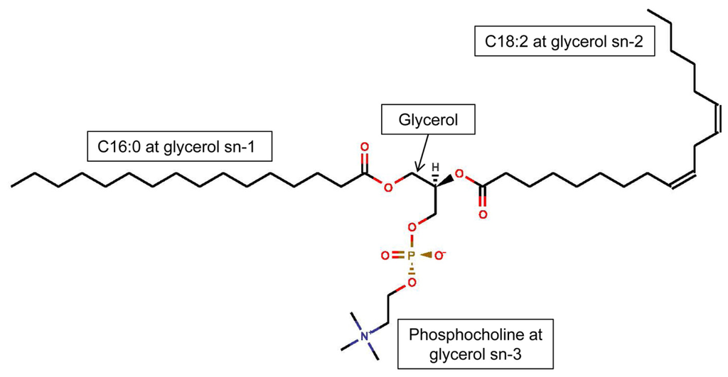 Phospholipids consist of glycerol, usually esterified to a saturated long chain fatty acid at sn-1 and to an unsaturated long chain fatty acid at sn-2, and to a phosphorylated head group at sn-3. This example is 1-hexadecanoyl-2-(9Z,12Z-octadecadienoyl)-sn-glycero- 3-phosphocholine.