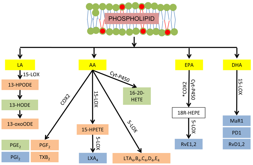 Fatty acyl chains of phospholipids located within the membranes of cells and organelles may be enzymatically oxidized into lipid mediators. Examples of proinflammatory (orange), resolving (blue), and variable function (green) lipid mediators are illustrated by fatty acid substrate (yellow) and biosynthetic enzyme. *: aspirin acetylated; LA: linoleic acid; AA: arachidonic acid; EPA: eicosapentaenoic acid; DHA: docosahexaenoic acid; COX: cyclooxygenase; Cyt-P450: cytochrome-P450 complex; HEPE: hydroxyeicosapentaenoic acid; HETE: hydroxyeicosatetraenoic acid; HODE: hydroxyoctadecadienoic acid; LOX: lipoxygenase; LT: leukotriene; LX: lipoxin; MaR: maresin; PG: prostaglandin; Rv: resolvin; PD: protectin; TX: thromboxane.