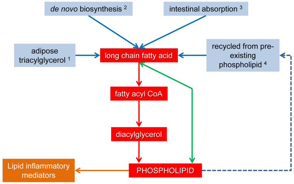The utilization of long chain fatty acids for de novo phospholipid biosynthesis (Kennedy pathway, red arrows and boxes), post-synthetic modification of phospholipids by reacylation (Lands’ cycle, green arrow), and the metabolism of phospholipids to oxidized lipid mediators of inflammation (orange arrow and box) in critical cells during inflammatory responses, such as vascular endothelial cells and mononuclear leukocytes. Origins of fatty acid substrate addressed in this review are (solid blue arrows and boxes) adipose triacylglycerol-derived fatty acid 1, fatty acid synthesized de novo2, recently absorbed dietary fatty acid 3, and phospholipid-derived fatty acid, cleaved by phospholipases then recycled for phospholipid biosynthesis 4 (broken blue arrow).