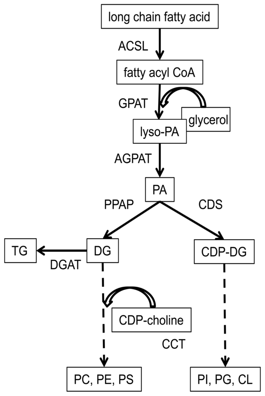 De novo biosynthesis of phospholipids occurs in what is commonly referred to as the Kennedy pathway [101]. A brief description of this pathway is useful to understand regulation of dietary PUFA incorporation into phospholipids. The first reaction in this pathway combines long-chain fatty acid with CoA and is catalyzed by acyl CoA synthase (ligase) (ACSL, Figure 4). The fatty acyl CoA is then esterified to glycerol at sn-1 on the mitochondria by glycerol-3-phosphoacyltransferase (GPAT) [12]. The second acyltransferase is 1-acylglycerol-3-phosphoacyltransferase (AGPAT). Substrate for AGPAT is transferred from the mitochondria to the endoplasmic reticulum, and acylation occurs at sn-2 of glycerol [12]. Glycerol esterified to fatty acid at sn-1 and sn-2 is known as phosphatidic acid. Phosphatidic acid can be metabolized by phosphatidic acid phosphatase (PPAP or lipin) to synthesize diacylglycerol. This combines with cytidine diphosphate (CDP)-choline to produce phosphocholine, which may be metabolized to phosphoethanolamine or phosphoserine. The enzyme cytidine triphosphate (CTP):phosphocholine cytidylyltransferase (CCT) catalyzes CDP-choline biosynthesis, and CDP-choline:1,2-diacylglycerol cholinephosphotransferase catalyzes the diacylglycerol reaction with CDP-choline [12]. Triacylglycerol is the alternative diacylglycerol product, catalyzed by diacylglycerol acyltransferase (DGAT) [102]. If phosphatidic acid is not utilized for biosynthesis of diacylglycerol, then it can be utilized by CDP-diacylglycerol synthase for synthesis of phosphoinositol, phosphoglycerol, or cardiolipin.