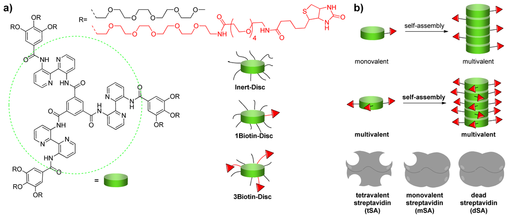 (a) Library of non- and biotinylated discotics; (b) Self-assembling multivalency of the discotics and the streptavidin mutants used in this study.