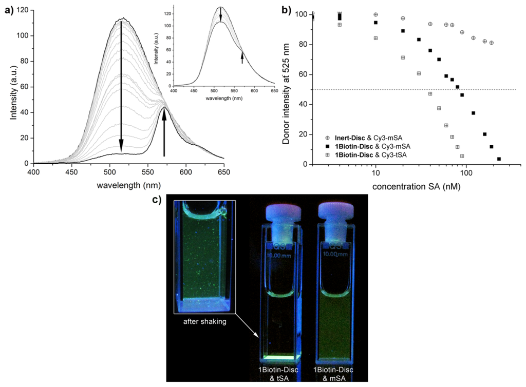 (a) Emission spectra of the titration of monovalent Cy3-labeled streptavidin (Cy3-mSA, 0 nM–270 nM) to 1Biotin-Disc (1 μM). Inset: Emission spectra of the titration of monovalent Cy3-labeled streptavidin (0 nM–270 nM) to Inert-Disc (1 μM); (b) Normalized decrease in disc intensity at 525 nm upon addition of Cy3-mSA or Cy3-tSA to 1Biotin-Disc and Inert-Disc (both 1 μM); Dashed line represents the intensity, where half of the donor intensity is quenched; (c) Photography of cuvettes under UV-light three days after Förster resonance energy transfer (FRET) titration.