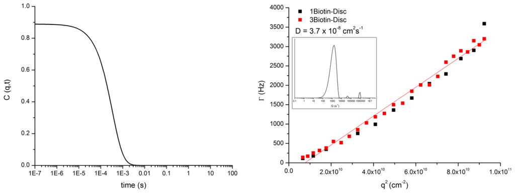 Left: Plot of the autocorrelation function of the 1Biotin-Disc at the 90° angle. Right: Plot of q2 vs. gamma of 1Biotin- and 3Biotin-Disc. From the q2 vs. gamma plots, the diffusion coefficient was extracted. The inset shows the distribution of species at the 90° angle for the 1Biotin-Disc.