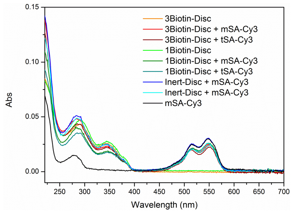 Cy3 labeled monovalent or tetravalent streptavidin (4 μM in PBS) was titrated to 1Biotin-Disc or 3Biotin-Disc or Inert-Disc (each 1 μM in PBS) in serial concentrations from 2 nM to 310 nM at 20 °C. After each addition the solution in the cuvette was intermixed by turning the closed cuvette several times upside-down. Fluorescence- (λex = 340 nm, λem = 400–650 nm) spectra were measured after each titration step. Additionally, UV absorption spectra were measured after addition of 70 nM of corresponding protein (see Figure 7) to confirm correct concentrations.