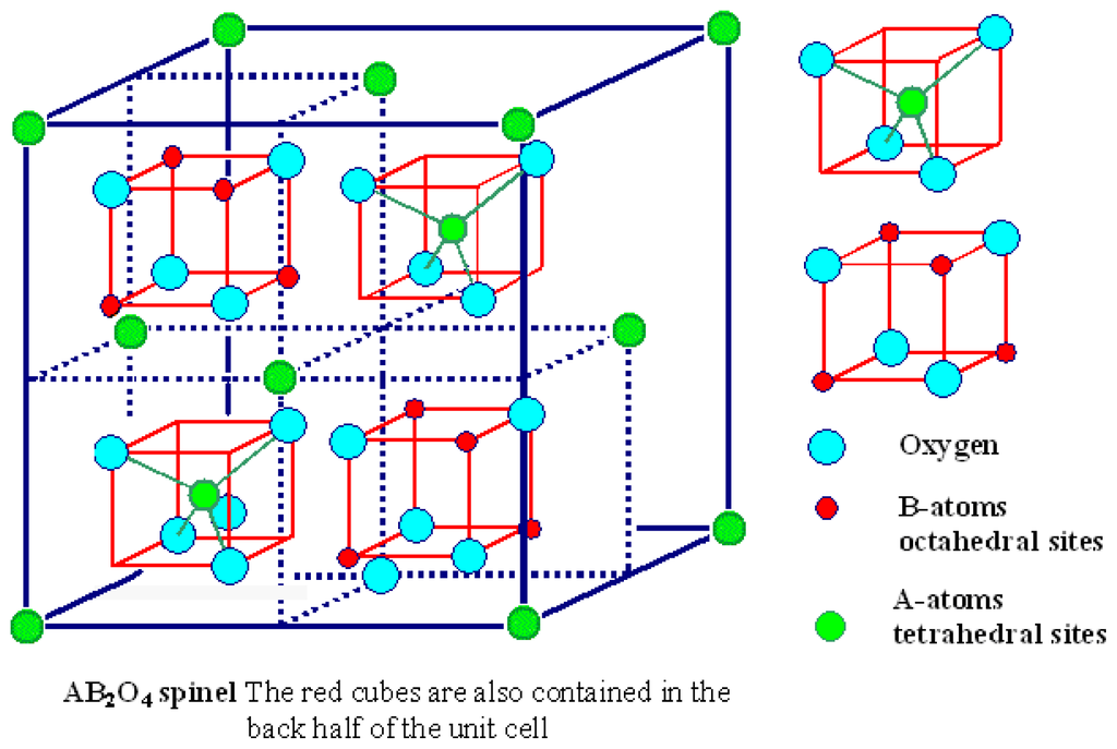 The unit cell of ferrite spinel structure (with lattice parameter value, d ~0.84 nm) is formed by 32 O2− anions and 24 cations (Fe2+, Zn2+, Co2+, Mn2+, Ni2+, Mg2+, Fe3+, Gd3+). There are 96 possible positions for cations in the unit cell (64 tetrahedral and 32 octahedral positions). The octahedral sites are larger than the tetrahedral sites. Only 8 tetrahedral positions and 16 octahedral positions are occupied by cations (divalent or trivalent).