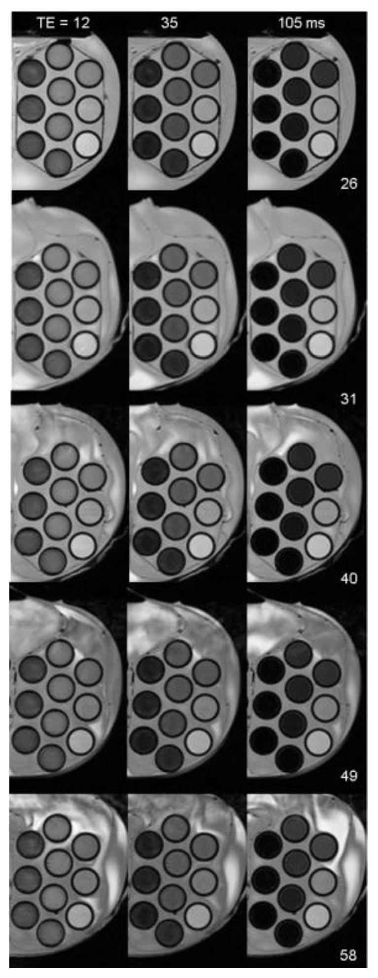 - Brooks, R.A.; Vymazal, J.; Baumgarner, C.D.; Tran, B.S.V. Comparison of T2 relaxation in. J. Magn. Reson. Imaging 1995, 4, 446–450. [Google Scholar]