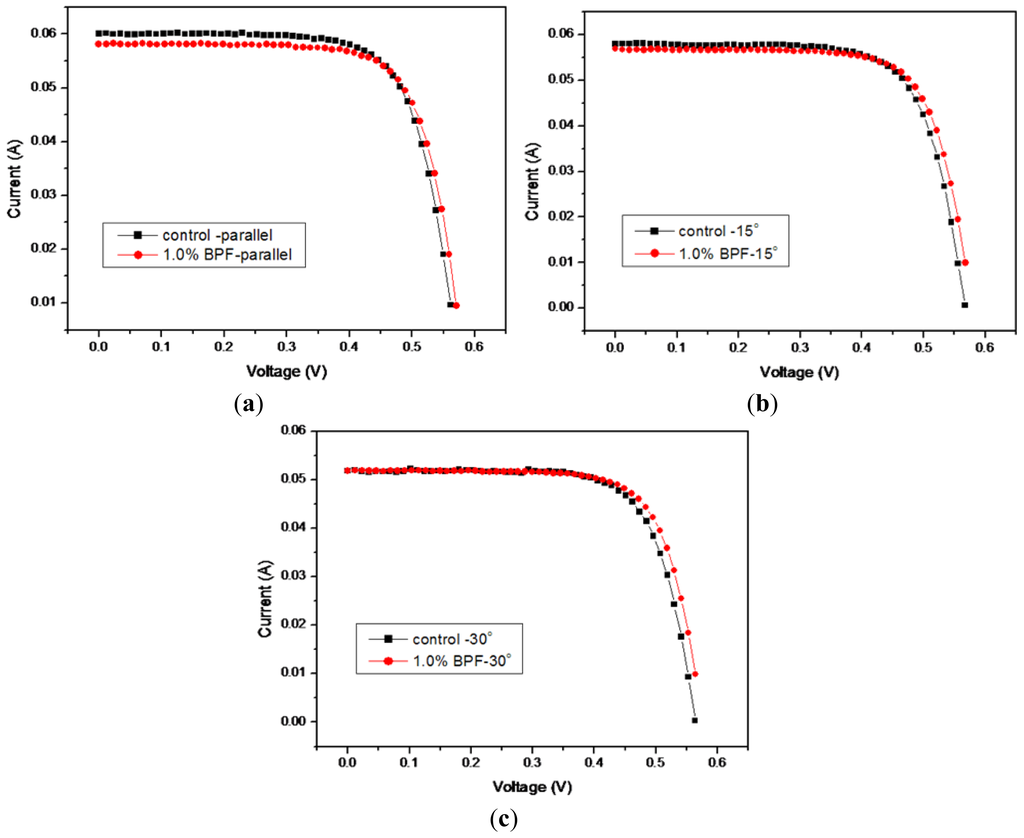 The measured I–V curves for the coated solar cell samples using 1% reactive mesogen liquid crystal precursor solution. The light incident angle was 0° for (a); 15° for (b); and 30° for (c). The control solar cell sample data are also included for the ones without the liquid crystal polymer coatings.