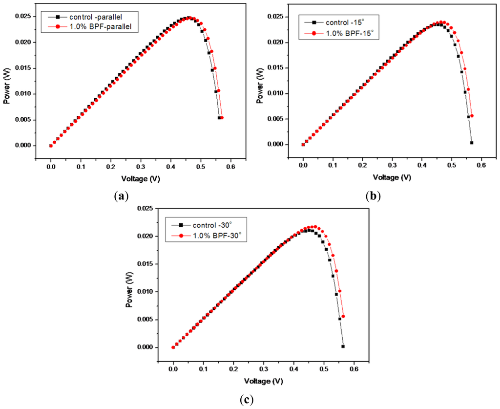The measured P–V curves for the coated solar cell samples using 1% reactive mesogen precursor solution. The light incident angle has been 0° for (a); 15° for (b); and 30° for (c). The control solar cell sample data are also included for the ones without the liquid crystal polymer coatings.