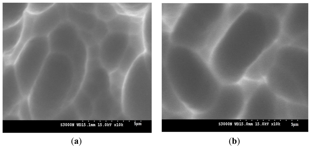 SEM surface micrographs of the silicon solar cell samples: (a) the control sample without polymer coating; and (b) the polymer-coated sample using 1% reactive mesogen precursor solution.