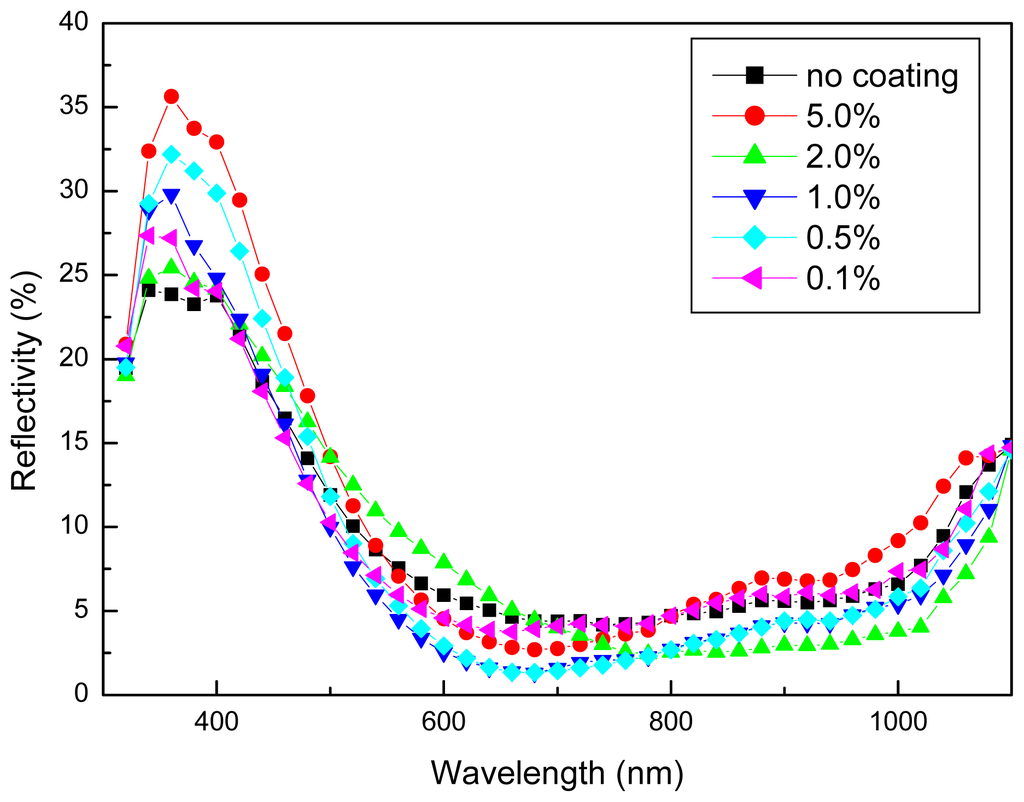 The reflectivity spectra for all the coated and non-coated solar cell samples in the wavelength range of 300–1100 nm.
