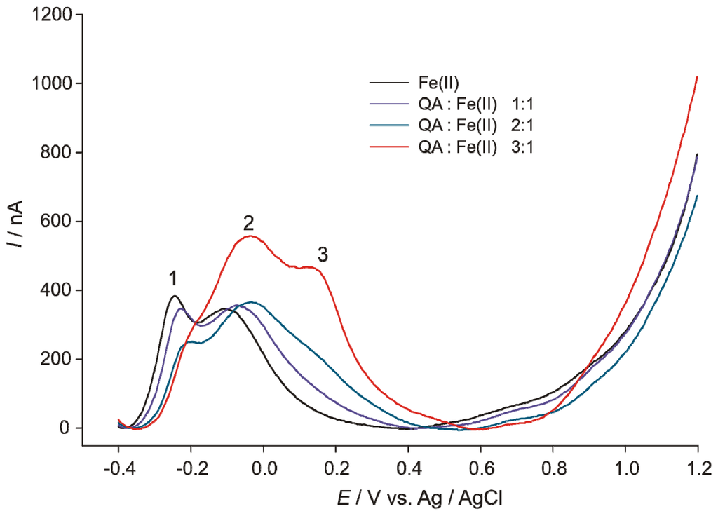 Figure 1). Iron(II) ions formed various coordination complexes with the buffer component phosphate, which resulted in a broad dominant peak with two maxima at the potentials at −0.244 V (1) and −0.099 V (2). The addition of QUIN caused an anodic shift in the peak potentials. Furthermore, the peak maximum (1) became less pronounced with increasing QUIN:Fe(II) ratios and a new maximum (3) appeared. This maximum was well visible at 0.155 V in the case of a 3:1 QUIN:Fe(II) ratio. The broadness of the peak depended on the various coordination complexes of Fe(II) ions with QUIN and phosphate. High QUIN concentrations replaced phosphate in the coordination complexes to a variable extent; the characteristic orange-yellow color of QUIN-Fe(II) appeared gradually. The voltammogram reflected the influences of QUIN on the redox potential of the central atom Fe. QUIN itself, however, showed no redox activity within the measured potentials range (data not shown). The electrochemical results suggest that only QUIN-Fe complexes can account for the pro- or anti-oxidant activity, as suggested by a previous study [