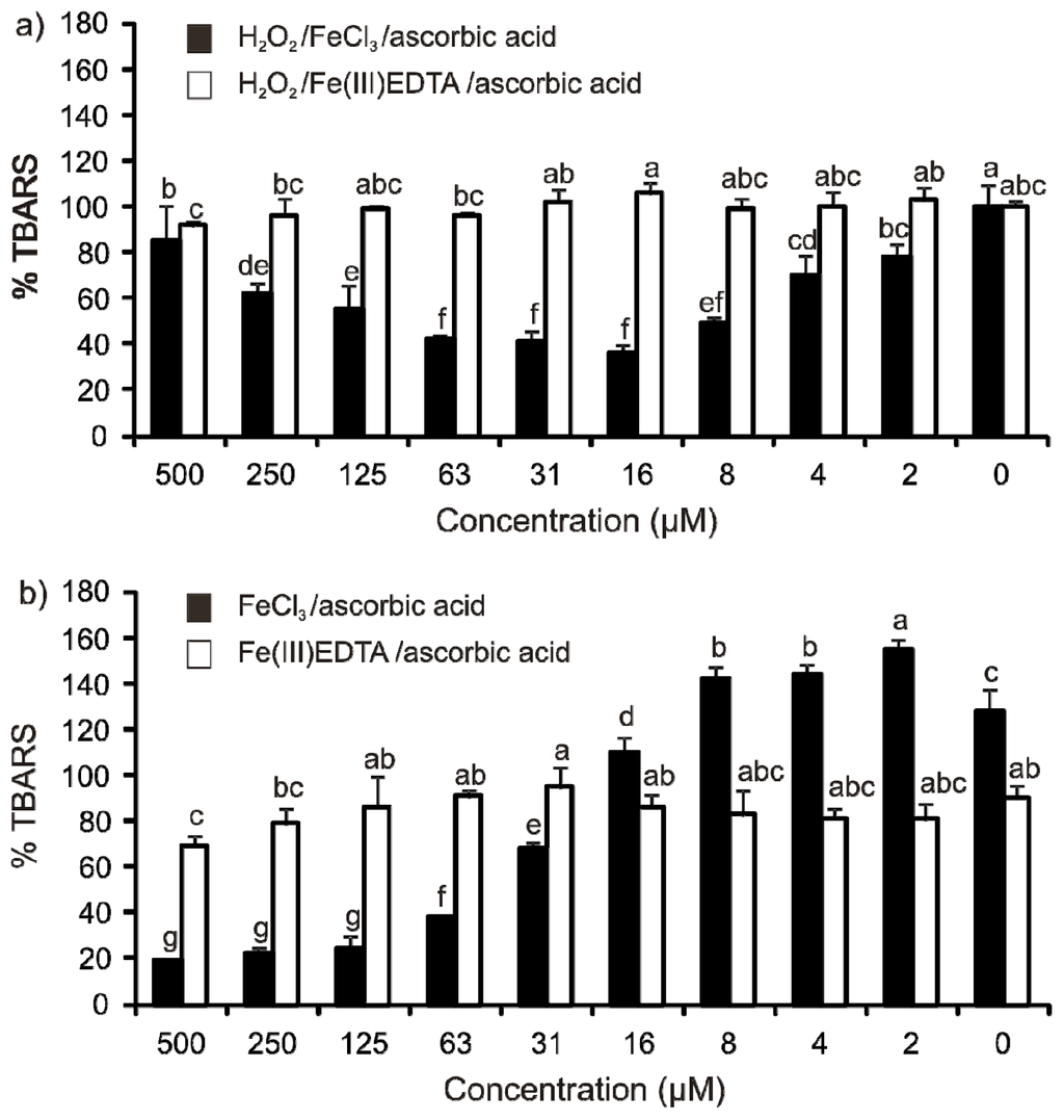 Figure 2b, black bars). When iron was predominantly liganded by QUIN, Fe(II)/Fe(III) redox cycling was less efficient in the reduction of molecular oxygen (2) compared to the coordination complexes with ascorbic acid, which also caused higher TBARS development than the Fe(III)EDTA complex. When iron is complexed with EDTA (