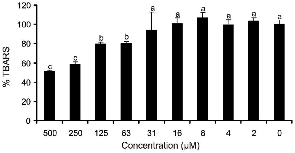 Figure 2a, black bars). In higher concentrations, 125–500 μM, by contrast, the level of TBARS increased gradually again. The dose-response curve showed a typical U-shaped form. QUIN probably removed Fe from the competitive ligands, ascorbic acid, phosphate and 2-deoxy-