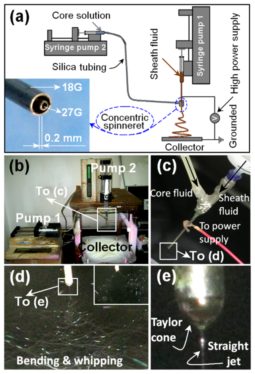 Coaxial electrospinning: (a) Schematic diagram of the process; the inset shows the nozzle of the homemade concentric spinneret; (b) Digital image showing the apparatus arrangement; (c) Connection between the power supply and the spinneret; (d) A typical fluid jet trajectory; the inset division of fluid jets is a result of a higher applied voltage of 16 kV; (e) A typical compound Taylor cone of the core/sheath fluids. Under a voltage of 14 kV and a collected distance of 20 cm with the flow rate of the sheath and core fluids are 1 and 0.7 mL/h, respectively, for the preparation of nanofibre F3.