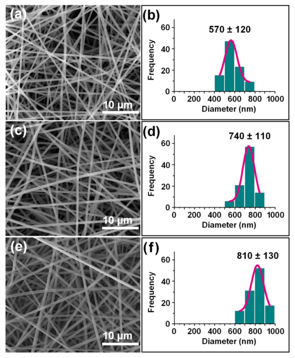 Field emission scanning electron microscope (FESEM) images of the electrospun nanofibres and their diameter distributions: (a and b) F1; (c and d) F2; (e and f) F3.