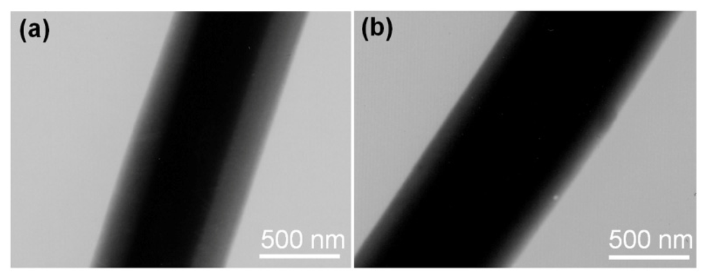 The nanofibres, F2 and F3, had clear core/sheath structures, with an estimated sheath thickness and core diameter of 400 nm and 180 nm for F2 and a value of 600 nm and 100 nm for F3 (Figure 3). Similar to the field emission scanning electron microscope (FESEM) results, no nanoparticles were discerned in the sheath and core parts. This finding suggests that these nanofibres have a homogeneous structure. The fast drying electrospinning process not only propagated the physical state of the components in the liquid solutions into the solid nanofibres, but also duplicated the concentric structure of the spinneret on a macroscale to nanoproducts on a nanoscale. As a result, the components in the sheath and core fluids occurred in the sheath and core parts of the nanofibres, respectively, with weak diffusion. Just as anticipated, the nanofibres of F3 (Figure 3b) had larger diameters and thicker sheath parts than those of F2 (Figure 3a). This difference could be attributed to the larger core flow rate for preparing F3 than for F2.