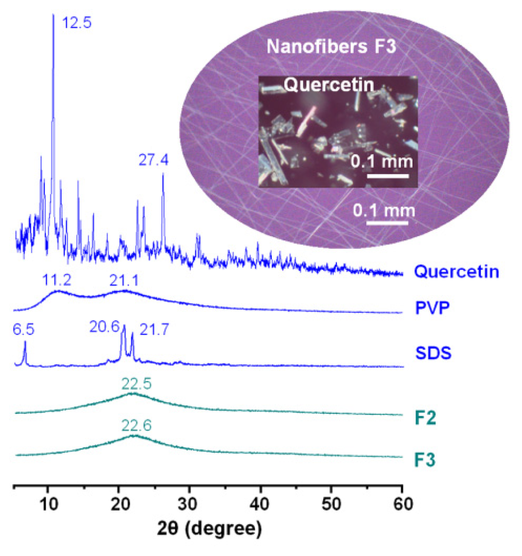 Differential scanning calorimetry (DSC) and X-ray diffraction (XRD) analyses were conducted to determine the physical state of quercetin in the core-sheath nanofibres. Quercetin, a yellowish green powder to the naked eye, comprises polychromatic crystals in the form of prisms or needles. The quercetin crystals are chromatic and exhibit a rough surface under cross-polarized light, while in sharp contrast, the core-sheath nanofibres show no colour (the inset of Figure 4). The data in Figure 4 show the presence of numerous distinct reflections in the XRD pattern of pure quercetin, similarly demonstrating its existence as a crystalline material. The raw SDS is a crystalline materials, suggested by the several distinct reflections. The PVP diffraction patterns exhibit a diffuse background with two diffraction haloes, showing that the polymers are amorphous. The patterns of fibres F2 and F3 showed no characteristic reflections of quercetin, instead consisting of diffuse haloes. Hence, the core-sheath nanofibres are amorphous: quercetin is no longer present as a crystalline material, but is converted into an amorphous state in the fibres.