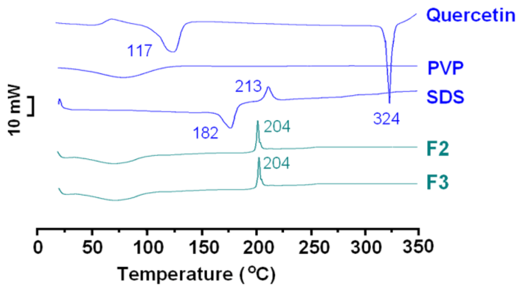 Physical status characterization: differential scanning calorimetry (DSC) thermograms of the raw materials (quercetin, PVP and SDS) and the core-sheath nanofibres, F2 and F3, prepared by coaxial electrospinning.