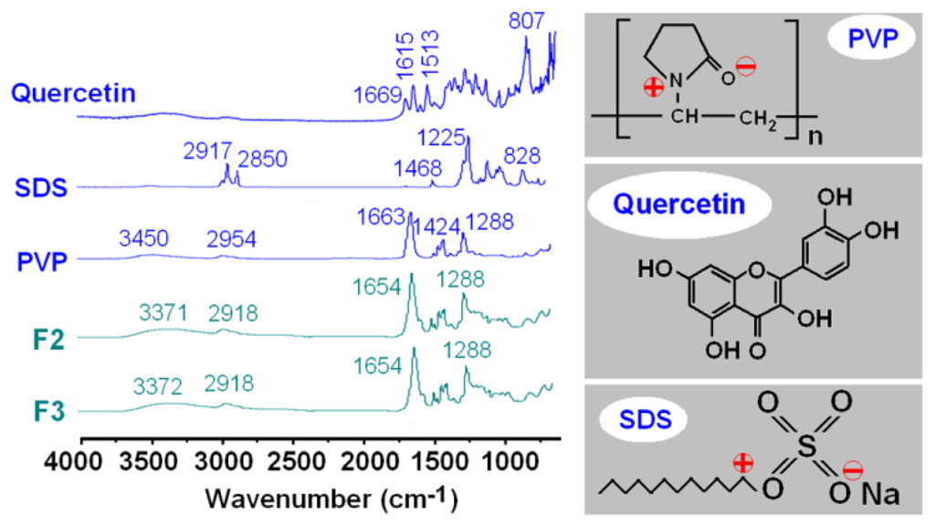 Attenuated total reflectance-Fourier transform infrared (ATR-FTIR) analysis was conducted to investigate the compatibility among the electrospun components. Quercetin PVP molecules possess free hydroxyl groups (potential proton donors for hydrogen bonding) and/or carbonyl groups (potential proton receptors; see Figure 6). Therefore, hydrogen bonding interactions between quercetin can occur within the core parts of nanofibre F2 and F3. ATR-FTIR spectra of the components and their nanofibres are shown in Figure 6. Three well-defined peaks are visible for pure crystalline quercetin, at 1669, 1615 and 1513 cm−1 corresponding to its benzene ring and –C=O group. All three peaks disappear after quercetin is incorporated into the core of nanofibres F2 and F3, and they are merged into a single peak at 1654 cm−1 in them. Almost all peaks in the fingerprint regions of quercetin have shifted, decreased in intensity or totally disappeared in the nanofibres’ spectra, which suggests that hydrogen bonding occurs between quercetin and PVP. In the sheath parts of nanofibres F2 and F3, the SDS molecules could distribute in the PVP matrix, due to the electrostatic interactions between the negatively charged SDS head group, the nitrogen atom on the pyrrolidone ring of PVP [] and, also, the attractive interaction between the negatively charged PVP oxygen (N+ = C–O−) and the electron poor C-1′ of SDS [].