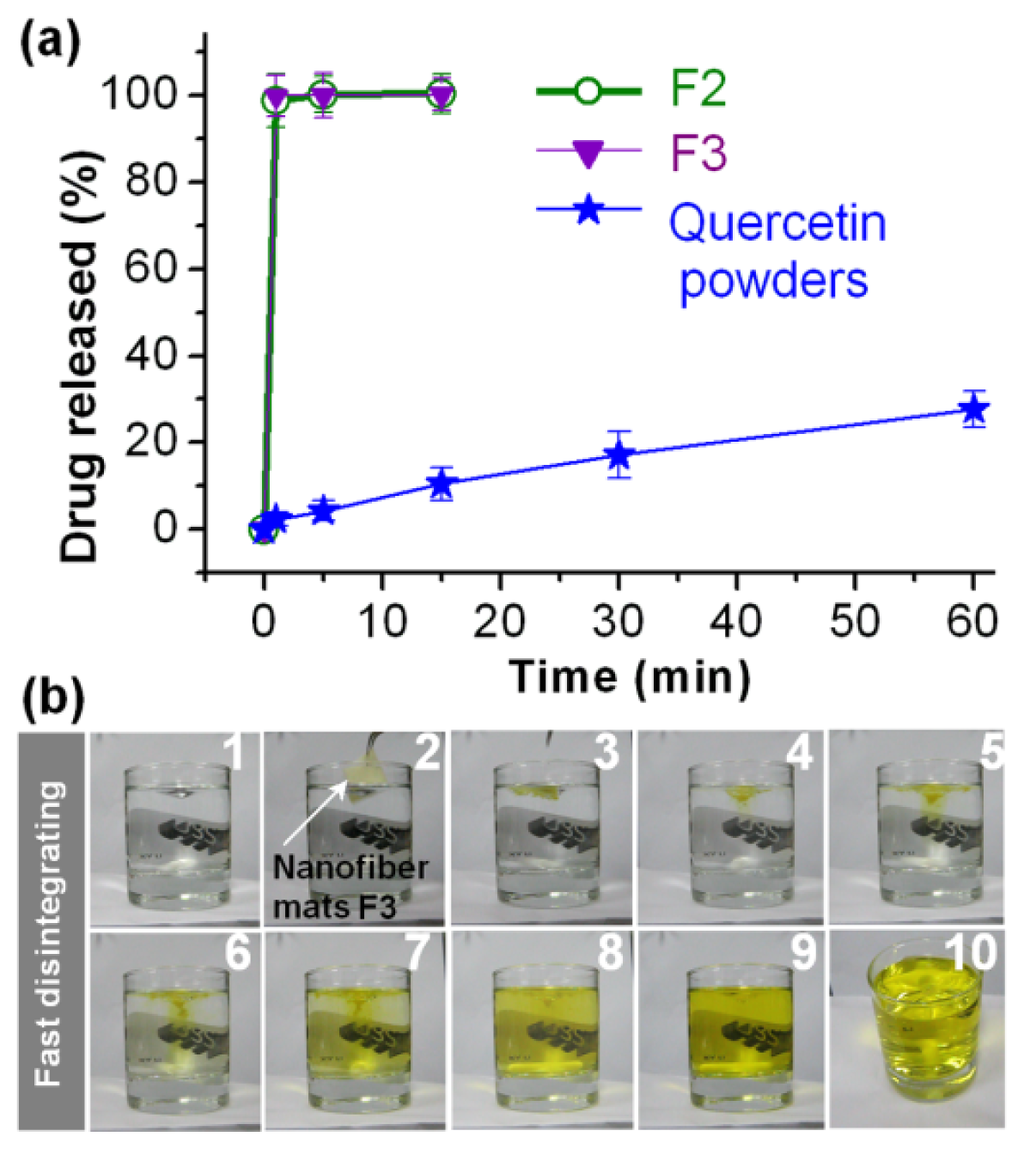 In vitro dissolution tests: (a) In vitro drug release profiles of the quercetin-loaded nanocomposites; (b) Photographs of the disintegrating process of nanofibres F3. The fast-dissolving process is shown in sequence from 1 to 10.