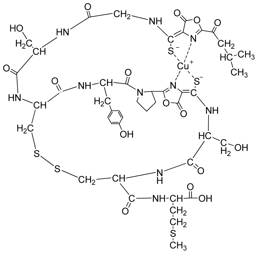 Methanotrophs are a group of ubiquitous Gram-negative bacteria that utilize methane as their primary source of energy and carbon. It is known that the amount of bioavailable copper regulates the methane monooxygenase (MMO) used by methanotrophs to oxidize methane []. Methanobactin (Mb) is a small, copper-binding peptide secreted by methanotrophs that extracts and uptakes copper outside of the bacterial cell. The crystal structure of copper-loaded Mb (Cu-Mb) from Methylosinus trichosporium OB3b revealed a 1217 Da molecule with a chemical composition of C45N12O14H62S5Cu (Figure 1) []. Mb can also bind to a number of other metals, including gold, iron, nickel, zinc, cobalt, cadmium, mercury and uranium []. It has been found that Au (III) can be reduced to Au (0), and then, Au (0) remains associated with the Mb. Examination of Au-Mb complexes by transmission electron microscopy (TEM) showed little to no detection of nanoparticles. However, if Au-Mb sample solutions were centrifuged or subjected to one freeze thaw cycle, gold nanoparticle formation was observed [].