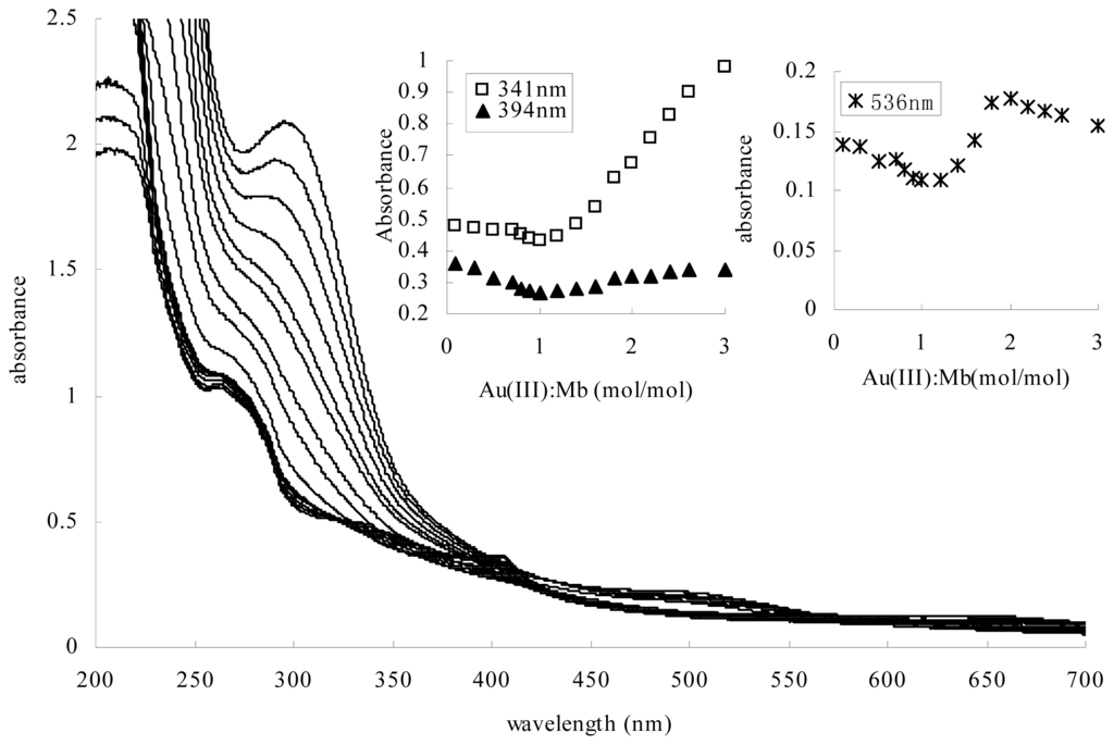 UV-visible absorption spectra of methanobactin (Mb) following the addition of Au (III).