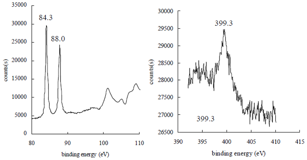 According to the reports [], the binding energies of metallic Au (0) 4f7/2 and Au (0) 4f5/2 are 83.8 eV and 87.7 eV, and the binding energies of Au 4f7/2 for the oxidized Au (III) are 86.5 eV. As shown in Figure 3, the X-ray photoelectron spectroscopy (XPS) of the gold nanoparticle samples has two gold signals, one at approximately 84.3 eV, which has been assigned to 4f7/2, and one at 88.0 eV, which has been attributed to 4f5/2. The binding energy of Au 4f7/2 is a little higher than that of the bulk gold at 83.8 eV, indicating the presence of Au (III) on the surface of gold nanoparticles. One nitrogen signal at approximately 399.3 eV was also observed in gold nanoparticle samples. This result suggested that the Au (III) was reduced to Au (0), but not Au (I), by Mb, and Mb-Au (III) chelation may attach on the surface of gold nanoparticles.