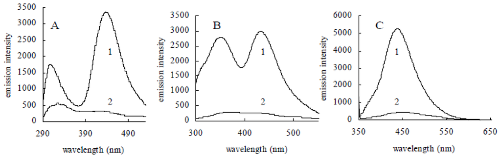 Emission spectra of Mb in aqueous solution with an excitation wavelength of 275 nm (A), 280 nm (B) and 335 nm (C), before (1) and after (2) the addition of HAuCl4.