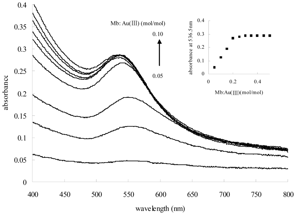 Gold nanoparticles exhibit strong plasmon resonance absorption, which is dependent on the particle size and shape. We synthesized ten gold nanoparticle batches using a consistent concentration of HAuCl4 and hydroquinone, but increasing the number of Mb. As expected, the ratio of Mb to Au (III) correlates to the surface plasmon resonance of gold nanoparticle formation. Upon increasing the molar ratio of Mb to Au (III) from 0.05 to 0.25, while keeping the HAuCl4 and hydroquinone concentrations constant, an increase in the intensity of the surface plasmon resonance feature with a blue shift from 547.5 nm to 536.0 nm could be observed (Figure 7). However, further increasing of the molar ratio of Mb to Au (III) from 0.30 to 0.50 showed a light enhancement, but no dramatic blue shift, in the surface plasmon resonance feature.