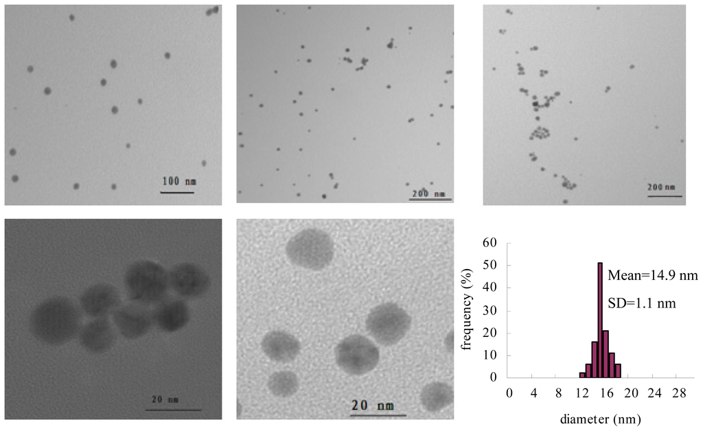 Taking the effect of Mb concentration into consideration, the conditions for gold nanoparticle formation were chosen to be 0.50 mM HAuCl4 and 0.75 mM hydroquinone to which is added Mb to a final concentration of 0.15 mM. TEM studies were performed on nanoparticles formed through this protocol. Illustrated in Figure 8 are TEM images of gold nanoparticles formed using the above protocol. The result obtained from the TEM study gave a clear indication regarding the shape and size of the nanoparticles. TEM micrographs of the gold nanoparticles taken at different magnifications showed that the sample is composed of spherical nanoparticles with a mean ratio of 1.13 of longest-to-shortest axes. The gold particles show an average size of 14.9 nm with a standard deviation of 1.1 nm. The relative standard deviation of the gold nanoparticles sizes is smaller than 8%. According to the report by Chen [] and Kaidanovych [], the effective monodispersed threshold was defined as a relative standard deviation below 15%. This suggests that the monodispersity of the resulting gold nanoparticles was better.