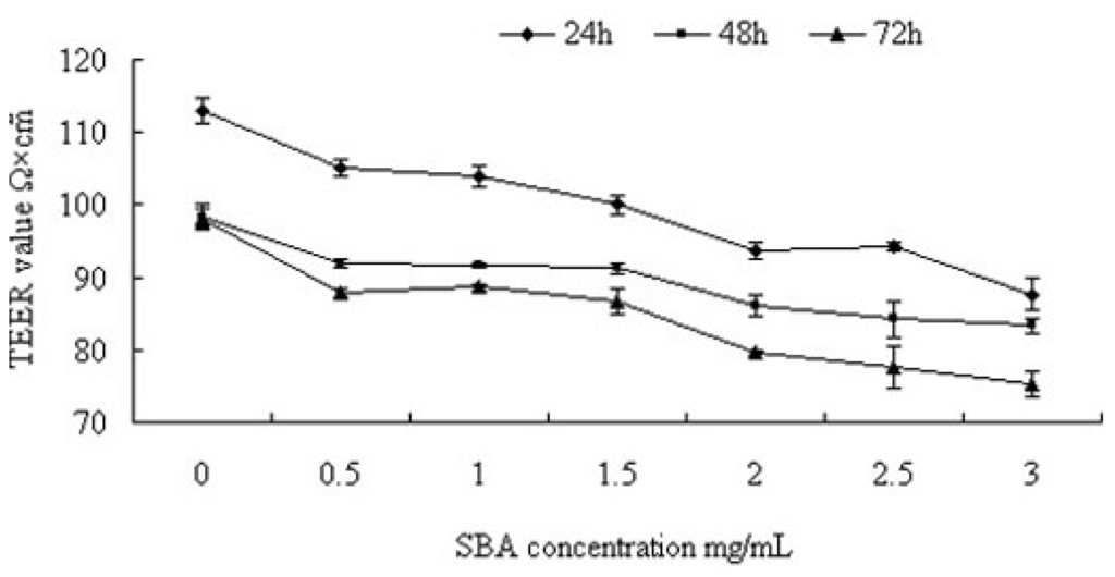 Effects of SBA on TEER in IPEC-J2 cells. Cells were treated with various concentration of SBA for 24 h, 48 h, or 72 h, TEER values are expressed in Ω × cm2 as the mean ± standard error from 3 independent experiments and presented a significant decline in a time and dose-dependent (p < 0.05). The control group was treated with 0 mg/mL SBA for the indicated times (24, 48, or 72 h). Treatment of 0.5, 1.0 or 1.5 mg/mL SBA group had a significant decrease compared with control (p < 0.05), in addition, 2.0, 2.5 or 3.0mg/mL had a significant decrease compared with 0.5,1.0 or 1.5 mg/mL SBA treatment groups (p < 0.05) (48 h or 72 h). However no significant differences were observed among 0.5, 1.0 and 1.5 mg/mL treatment, or between the 2.0 and 2.5 mg/mL SBA treatment (p > 0.05).