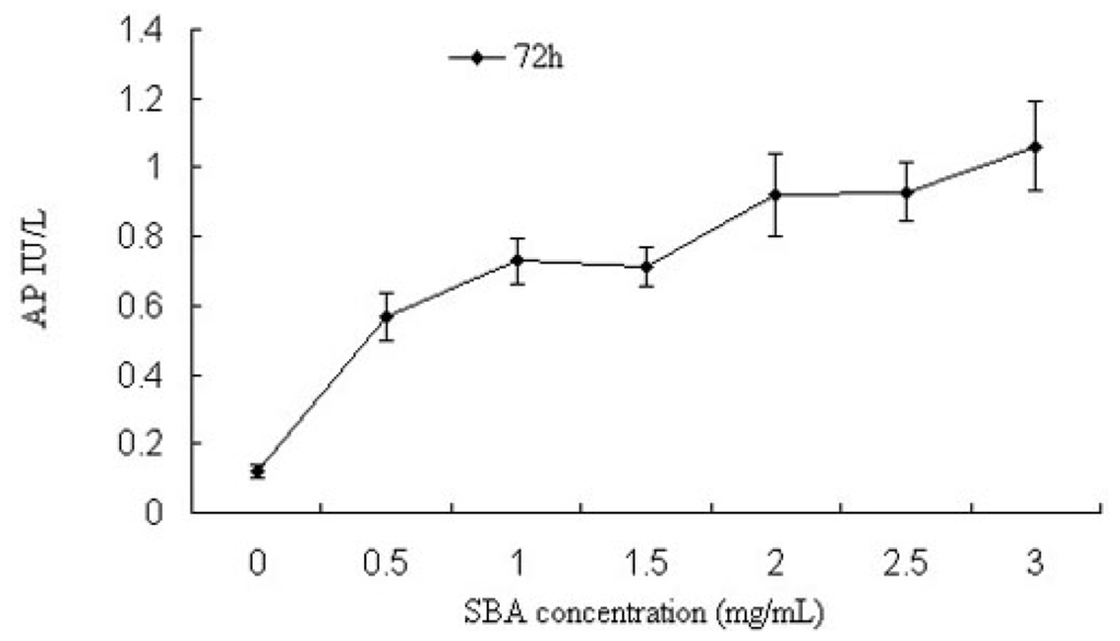 Effects of SBA on AP activity in IPEC-J2 cells. Cells were treated with various concentration of SBA for 72 h, culture supernatants were collected, and AP activity was measured. The control cells were treated with 0 mg/mL SBA for 72 h. Values are the mean ±SD from 4 independent experiments. Treatment of 0.5, 1.0 or 1.5 mg/mL SBA was significantly higher than control (p < 0.05), and the 2.0, 2.5 or 3.0 mg/mL SBA treatment were even higher than treatment of 0.5, 1.0 or 1.5 mg/mL (p < 0.05). However, no significant differences were observed among 0.5, 1.0 and 1.5 mg/mL treatment; or 2.0, 2.5 and 3.0 mg/mL SBA treatment (p > 0.05).