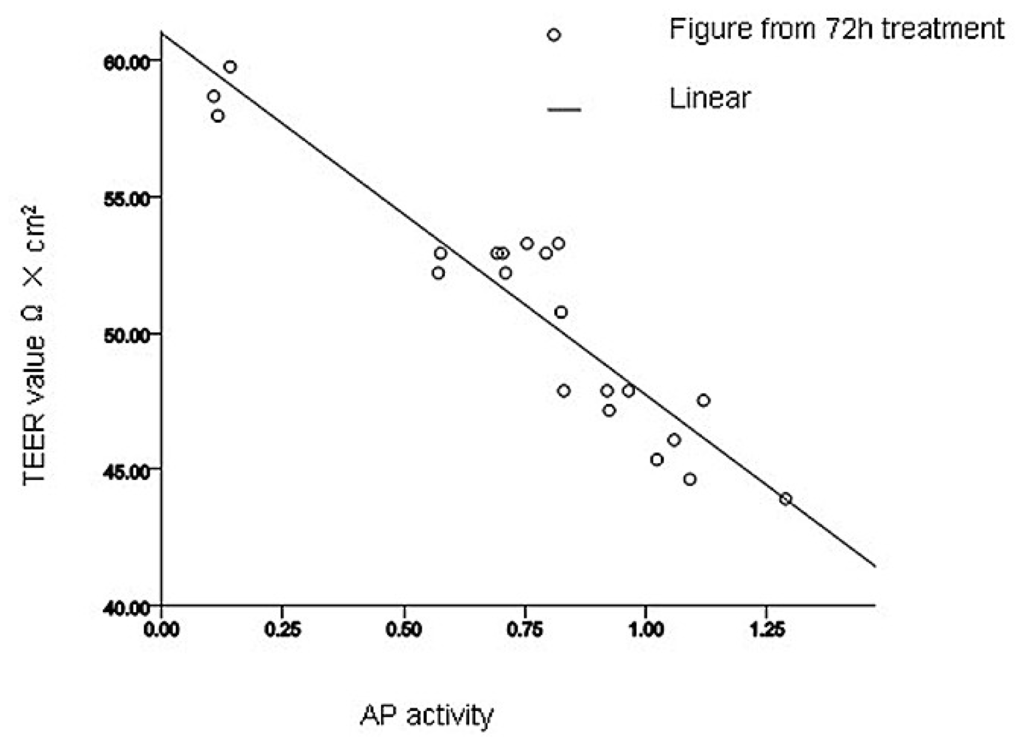Linear correlations between AP activity and TEER value after 72 h treatment with 0, 0.5, 1.0, 1.5, 2.0, 2.5, or 3.0 mg/mL SBA. The formula was obtained by SPSS 17.0 software (SPSS Inc, Chicago, IL, USA. nAP = 28, nTEER = 21, y = 60.976 − 13.251x, R2 = 0.883, R2 = 0.883, p < 0.01, TEER values were dependent variable, AP activity were independent variable.