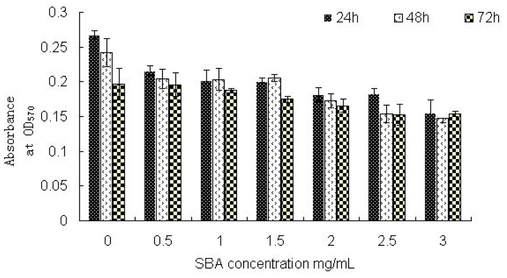 3-(4,5)-dimethylthiahiazo(-z-y1)-3,5-di-phenytetrazoliumromide (MTT) was usually used as a yellow dye to detect cell survival and growth. Obvious reductions in absorbance (18.5%, 15.7%, and 0.5%, respectively) were obtained when cells were treated with 0.5 mg/mL SBA for 24, 48, or 72 h (p < 0.05) whereas no significant differences were observed when comparing the different time points (p > 0.05). Treatment with 0.5, 1.0, 2.0, or 3.0 mg/mL SBA for 24 h resulted in significant decreases in absorbance (18.5%, 23.8%, 31.3%, and 41.5%, respectively and a significant decrease among these groups. p < 0.05) compared to the control (p < 0.05, Figure 4). However, no significant differences were observed between 1.0 and 1.5mg/mL treatment; or 2.0 and 2.5 mg/mL SBA treatment (p > 0.05). When the cells were treated with different concentrations of SBA for 48 or 72 h, regular decreases in MTT values were found.