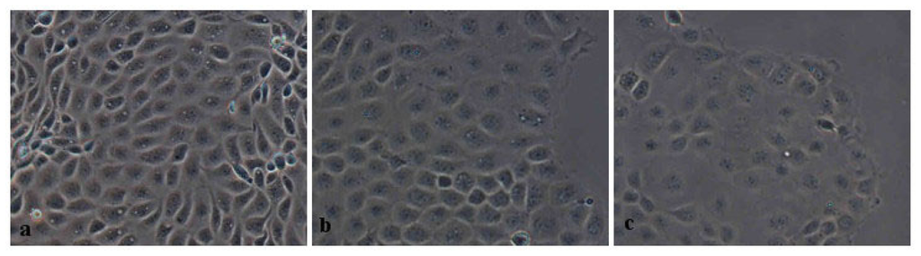 Representative microphotographs demonstrating the effects of SBA on the morphology and growth of IPEC-J2 cells. Cells were cultured to confluence and incubated with the 0 mg/mL (a), 0.5 mg/mL (b), 2.0 mg/mL (c) of SBA for 48 h; 0 mg/mL of SBA treated cells are shown as the control. Magnification, 200×.