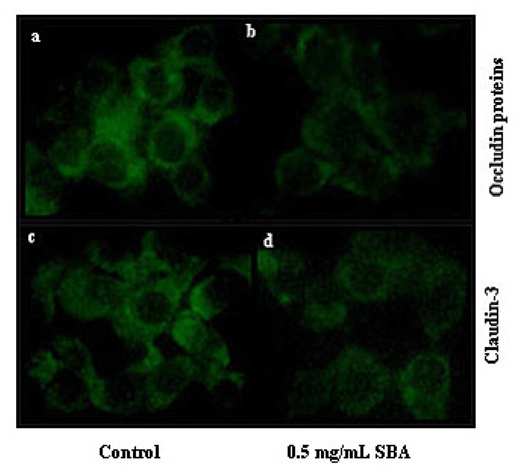 TJs determine the integrity and permeability of epithelial cells. Therefore, we next tested the effects of SBA on the distribution and expression of TJ proteins (occludin and claudin-3) using immunofluorescence labeling and confocal microscopy. These TJ target proteins were located at the cell-cell contact regions, as shown in (Figure 6). However, after treatment with 0.5 mg/mL SBA, the morphology of the cells was altered and the staining intensity and membrane localization of occludin and claudin-3 proteins were obviously decreased when compared with the control.