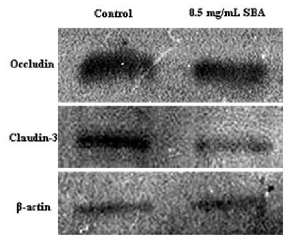 Western blotting of tight junction proteins following SBA treatment. Fifteen microliters of 0 (Control) or 0.5 mg/mL SBA-treated total protein extracts were analyzed by immunoblotting with antibodies for occludin and claudin-3. β-actin was used as a loading control. Representative western blots from 4 independent experiments are shown.