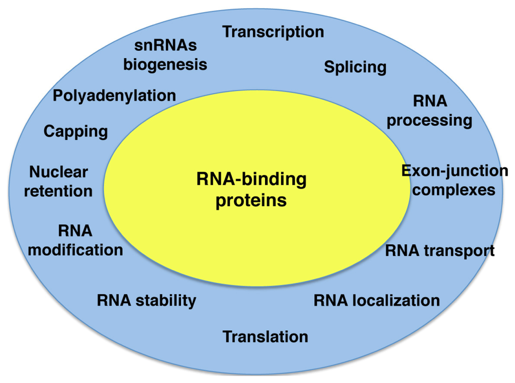 RNA plays a central role in gene expression. Within the cell RNA molecules are associated to RNA-binding proteins (RBPs) forming dynamic ribonucleoprotein particles (RNPs) that affect all steps of RNA metabolism []. RBPs assemble on nascent and processed mRNAs, governing gene regulation at post-transcriptional level in health and disease. Indeed, mutations affecting the function of RBPs cause several diseases []. RBPs are major components of the cell that control transcription, splicing, catalytic processing, transport, localization, translation or RNA stability processes (Figure 1). These steps in the RNA lifespan are closely connected to each other, such that altering one of them will affect the others.