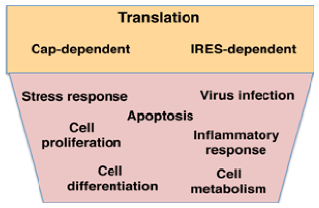 RNA-binding proteins control translation efficiency of mRNAs initiating protein synthesis by the conventional cap-dependent, or the alternative internal ribosome entry site (IRES)-dependent, mechanisms (orange box), impacting on cellular processes in cells undergoing normal growth as well as in response to environmental stresses (pink box).