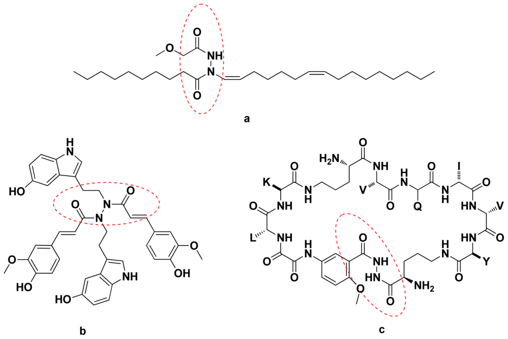 In recent years, many diacylhydrazines have been isolated from natural products and displayed good biological activities. For example, Elaiomycin {[(2S,3S)-3-hydroxy-1-methoxybutan-2-yl]-imino-oct-1-enyloxidoazanium} (Figure 1a) is a natural compound isolated from submerged culture filtrates of Streptomyces gelaticus; it exhibits strong in vitro inhibition of virulent and avirulent forms of the bovine and human strains of Mycobacterium tuberculosis [1]. Montamine (Figure 1b), isolated from C. montana, is a new natural product that exhibits anti-oxidation activity [2]. Macrocyclic β-sheet peptides (Figure 1c) inhibit the aggregation of a tau-protein-derived hexapeptide [3]. Also diacylhydrazines are a class of insect growth regulators that have been found to act as nonsteroidal ecdysone agonists [4]. On the other hand, many synthetic diacylhydrazine compounds also exhibit a broad spectrum of biological activities, such as anti-HIV [5], fungicidal [6], ketol-acid reductoisomerase inhibitor (KARI) [6], plant growth regulatory activity [7], etc. 2,4-Dichlorophenoxyacetic acid (2,4-D) and their derivatives also exhibit many biological activities, such as antifungal activities [8], herbicidal activities [9], plant growth regulation activities [10] and so on.