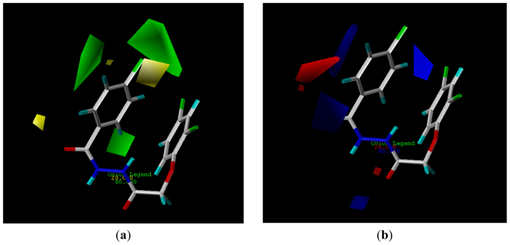 With the CoMFA analysis, we obtained the isocontour diagrams of the steric and electrostatic field contributions (“StDev*Coeff”), which is displayed in Figure 3. In Figure 3a, the steric field contours are represented with different colors: the green color at 3- or 4-position means a bulky group here would be favorable for higher antifungal activity, while the yellow color means the opposite. As shown in Figure 3a, there is a green region located around the 4-position of the benzene ring, indicating that the bulky groups at this position will increase the herbicidal activity. This is in agreement with the actual experimental data: for example, compounds 4c–e,l,m all have higher antifungal activity with a bulky group in this position. In the same Figure 3b, the electrostatic contours are displayed in distinguishable colors: blue indicates that an increase in the positive charge will lead to an increase in the activity, while the red contour defines the opposite. So, the target compounds bearing an electron-withdrawing group at the 2-position of the benzene ring and an electron-donating group at the other positions displayed higher activity. These results provided useful information for further optimization of the compounds.