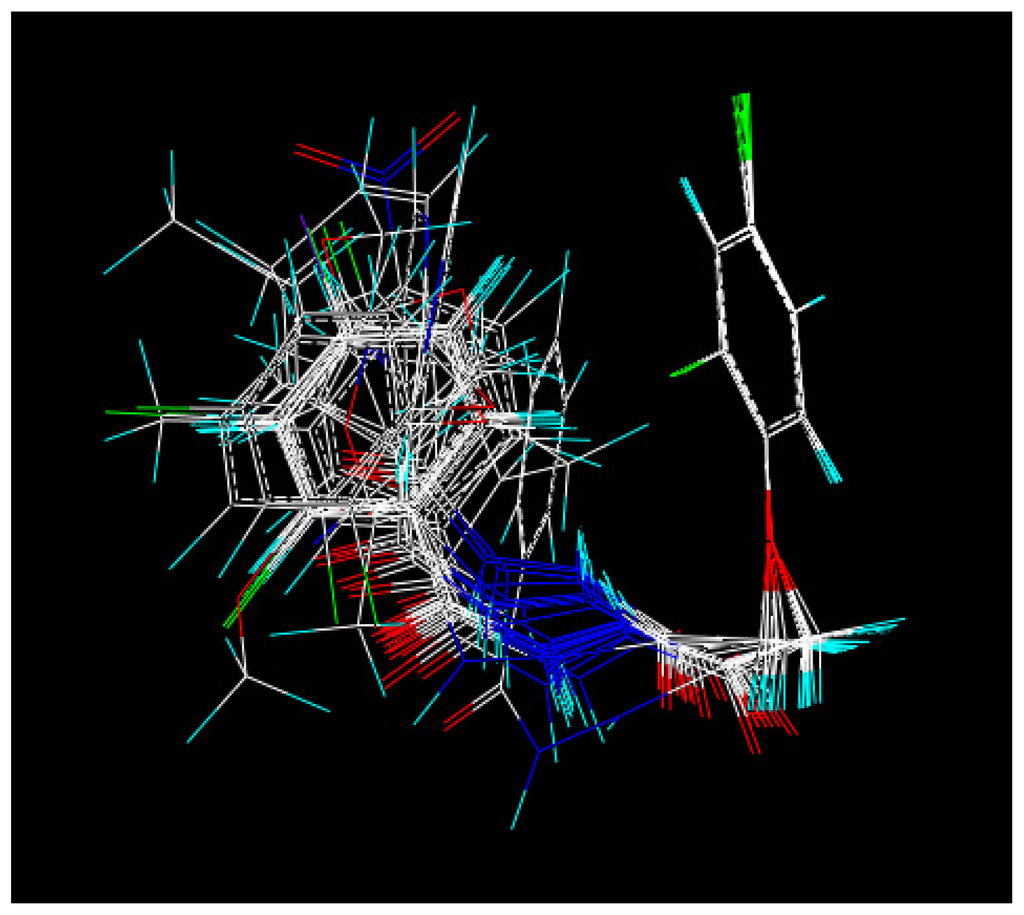 where I is the percent inhibition and Mw is the molecular weight of the tested compounds. The compound 4d was used as a template to build the other molecular structures. Because these compounds share a common skeleton, 9 atoms marked with an asterisk were used for rms-fitting onto the corresponding atoms of the template structure (Figures 4 and 5).