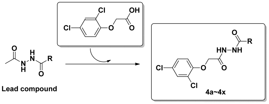 Referring to the reported references for function of diacylhydrazine derivatives, N,N′-diacylhydrazines are important insecticides in agriculture [34,35]. In our laboratory, we synthesized some diacylhydrazine derivatives successfully. They displayed good herbicidal activities [8], antifungal activities [6], radical scavenging activity [6], and plant growth regulatatory activity [8]. In order to find novel structural and non-resistance antifungals, the title compounds were designed by introducing 2-(2,4-dichlorophenoxy) acetic acid pharmacophore into the diacylhydrazine scaffold. Our original strategy is depicted in Scheme 1.