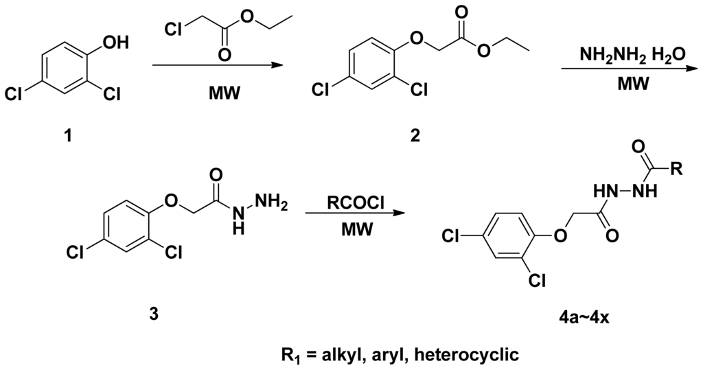 2,4-Dichlorophenol (5 mmol), potassium iodide (KI) (1 mmol), N,N-dimethylformamide (DMF) (1 mL), ethyl 2-chloroacetate (5 mmol) and Tetrabutyl Ammonium Bromide (TBAB) (0.5 mmol) were placed in a dried round-bottomed flask, and the mixture was irradiated using microwaves (200 W) for 5 min. On completion of the reaction, the mixture was cooled to room temperature and then added to ethanol (10 mL) with constant stirring. After filtering off the inorganic salts, the reaction mixture was added to 85% hydrazine hydrate (5 mmol) and subjected to microwave irradiation (500 W) for an additional 2 min. Then, it was cooled to room temperature, allowed to settle for 1 h, and the precipitates were filtered off and recrystallised from ethanol to afford the pure product 3. Then 3 (1 mmol) and substituted acyl chloride (1 mmol) were mixed in Tetrahydrofuran (THF). The mixture was put into the microwave oven (400 W) and irradiated for 10 min to produce the crude solid, which on recrystallization with ethanol gave the pure product as shown in Scheme 2.