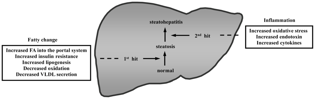 The “two-hit” theory for the pathogenesis of nonalcoholic fatty liver disease and nonalcoholic steatohepatitis. Hepatic steatosis is the initial step that occurs commonly. Then, the liver progresses from steatosis to steatohepatitis through the action of a second step. The progression from normal liver to steatohepatitis is a multistep process involving the development of fatty changes and hepatic inflammation.