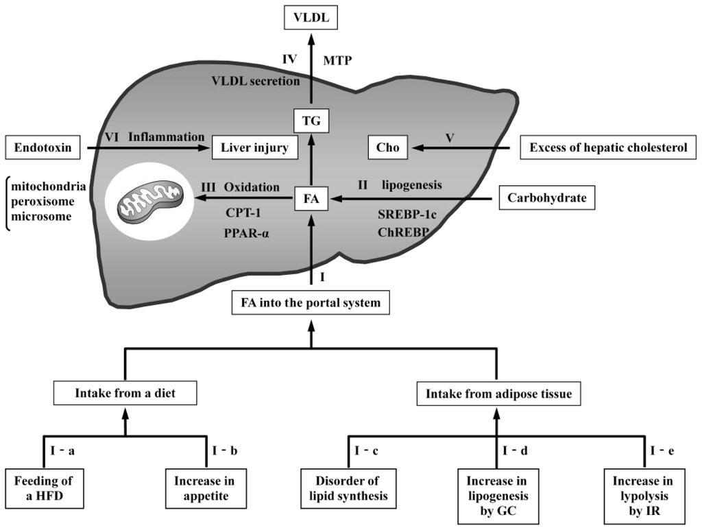 Mechanisms of NAFLD pathogenesis in rodent models. Dietary triglycerides (TG) are transported in the circulation as chylomicrons. The TG in chylomicrons are degenerated into fatty acids (FA) by lipoprotein lipase (LPL) and delivered to the liver. Furthermore, FA degenerated in adipose tissue are also delivered to the liver. (I) Increased FA from dietary intake or adipose tissue cause fatty changes in the liver. (I-a) Feeding of a high-fat diet (HFD) induces an increased supply of FA; (I-b) increased appetite causes an increased supply of FA as a result of excess dietary intake; (I-c) disordered lipid synthesis in adipose tissue places additional FA directly into the portal system; (I-d) high circulating glucocorticoid (GC) levels cause increased FA induced by lipogenesis; and (I-e) resistance to the antilipolytic action of insulin in adipose tissue results in the excessive release of FA; (II) Hepatic FA are synthesized from carbohydrates through pathways regulated by sterol regulatory element-binding protein-1c (SREBP-1c) and carbohydrate response element-binding protein (ChREBP). The overexpression of these proteins produces excessive FA in the liver, leading to fatty changes; (III) FA oxidation occurs in the mitochondria, peroxisomes, and microsomes. Carnitine palmitoyltransferase 1 (CPT1) controls the transport of acyl-CoA into the mitochondria. Peroxisome proliferator-activated receptor alpha (PPARα) is a transcription factor that regulates oxidation pathways. Reduced oxidation results in fatty changes by increasing hepatic FA; (IV) Hepatic TG are released from the liver as components of VLDL. Microsomal triglyceride transfer protein (MTP) regulates the synthesis of VLDL. Decreased VLDL secretion causes the accumulation of FA in the liver; (V) Hepatic cholesterol accumulation leads to calcium depletion and endoplasmic reticulum (ER) stress, with the activation of the unfolded protein response and ER stress-induced apoptosis; (VI) Low-dose endotoxin induces liver injury in HFD-induced steatosis.