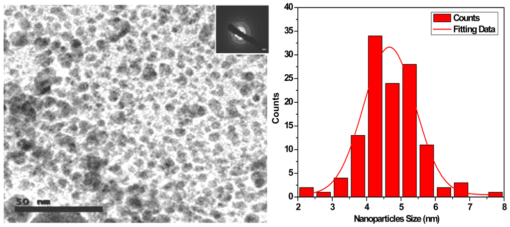 HRTEM was employed to obtain direct information about the size of the produced Ag nanoparticles. Figure 1 shows the HRTEM image and the distribution size diagram of the Ag nanoparticles. The particles were separately dispersed on a on a carbon coated copper TEM grid and transmission electron microscopy (TEM) investigations were analyzed. TEM image of Ag nanoparticles revealed crystalline, free-standing, and approximately spherical particles as well as a number of aggregates. Average particle size calculated by log-normal fitting to the size distribution histogram, was obtained as 4.66 nm. The silver nanoparticles are crystalline, as can be seen from the selected area diffraction pattern recorded from one of the nanoparticles in the aggregates (Figure 1 Inside). The separation between the silver nanoparticles seen in the TEM image could be due to capping by proteins and would explain the UV-Vis spectroscopy measurements, which is characteristic of well-dispersed silver nanoparticles. These monodispersed silver nanoparticles (biosynthesized by Trichoderma viride) showed emission in the range of 320–520 nm wavelength []. Considering the UV-vis intensity, wavelength, TEM and particle size distribution the most promising results obtained indicate that, the optimum conditions for preparation of silver nanoparticles colloids with excellent size and size distribution ranged from 3 to 8 nm could be produced using 10 g biomass of fungus F. solani; 0.085 g AgNO3; pH 12; temperature, ~25 °C and duration, 48 h []. The morphology of the nanoparticles synthesized by Trichoderma reesei was highly variable and these assemblies were found to be aggregates of silver nanoparticles in the size range 5–50 nm []. In addition, the nanoparticles were not in direct contact even within the aggregates, indicating stabilization of the nanoparticles by a capping agent []. AgNPs synthesized by different species of Trichoderma were found single or aggregated with round and uniform in shape and 6–80 nm in size []. Efficacy of AgNPs biosynthesis was reported due to reductase action or by electron shuttle quinones or both []. In fact, it is shown that the presence of hydrogenase and nitrate reductase are essential elements for metal reduction [,].